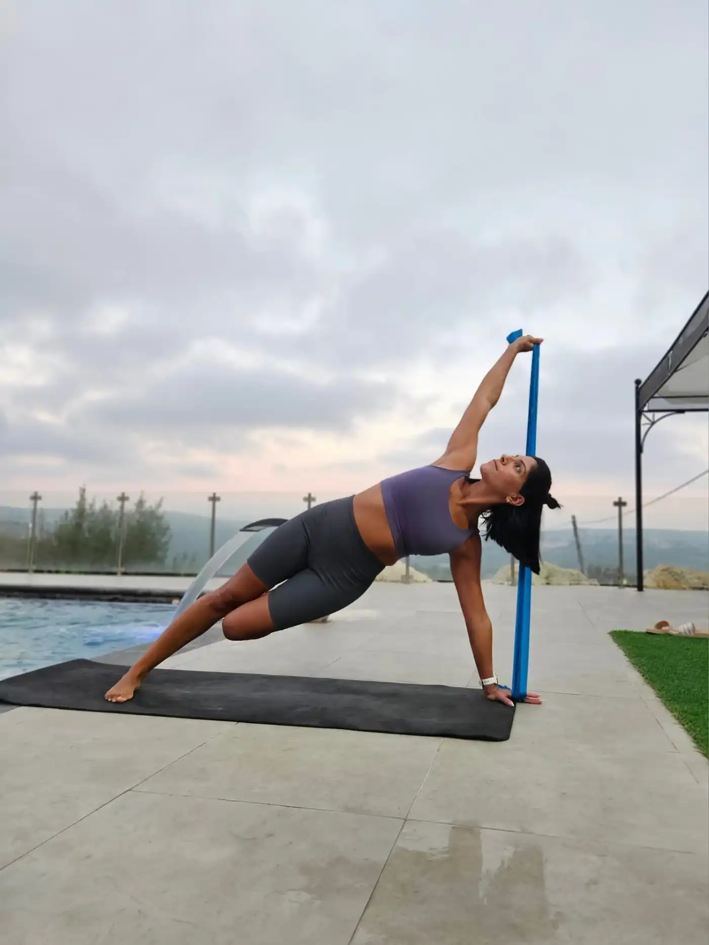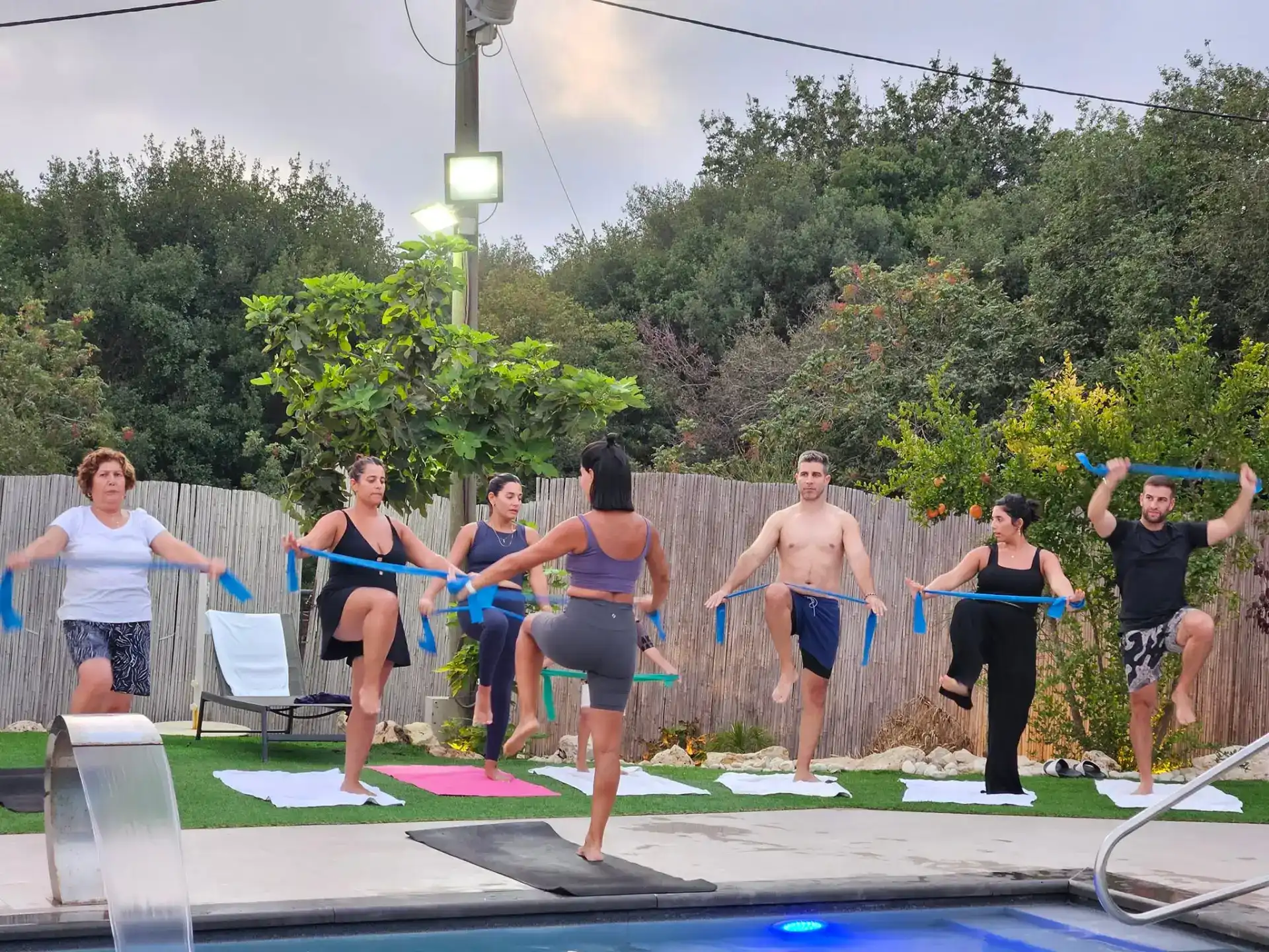אימון פילאטיס קבוצתי באווירה פתוחה ומרעננת.